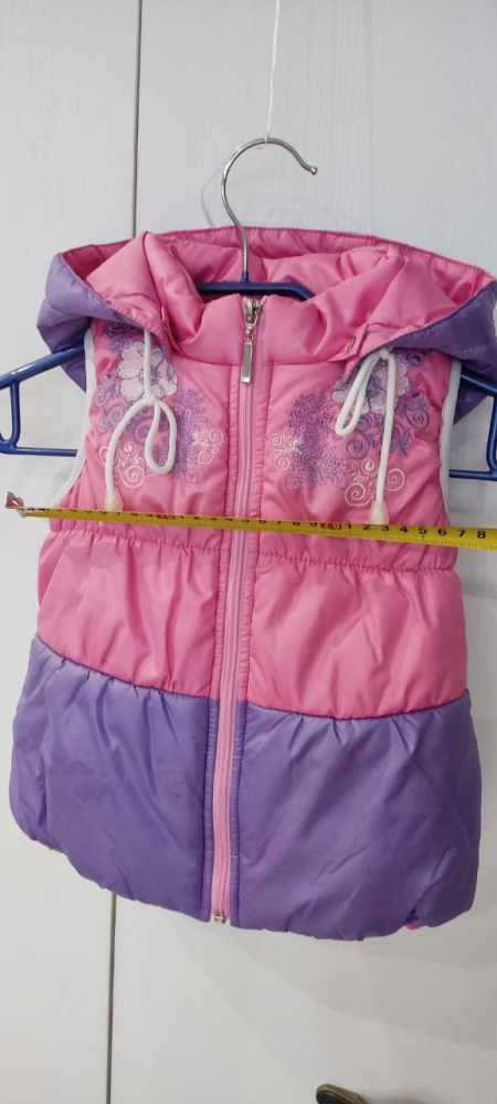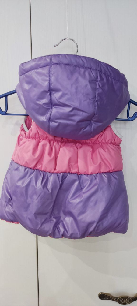 Жилет утепленный для девочки, размер 26. Из дизайнерской коллекции, ткань с пропиткой от грязи, водооталкивающая и "дышащая" И ткань и наполнитель разработаны специально для детей, производителем, гипоаллергенны. Спереди на молнии, капюшон отстегивается, на кнопках, вся фурнитура качественная(!) ,воротник стойка защитит от ветра, прорези для рукавов на резинке для более плотного облегания. Замеры длина-38 и ширина-28см. Светлые сочные краски, они как перламутровые, не матовые, очень красивые, на фото не так передаются цвета, к сожалению. Утеплитель специально изготавливают у себя в цехах, гиппоаллергенный, для дет. одежды. (не Китай!!!). Есть видео Отдам за 500р.