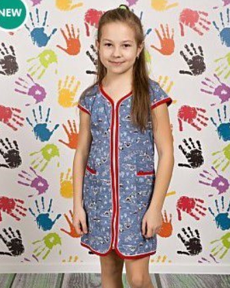 Халат на молнии, изготовлен из х/б полотна. Спереди расположены два кармана. Все срезы халата обработаны бейкой с кантом контрастного цвета